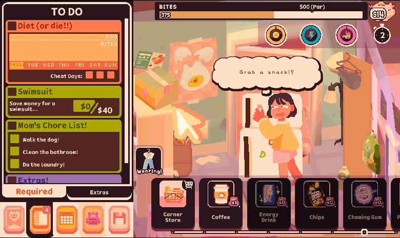 Le thème du jeu n’est pas foncièrement drôle, mais tout le reste est hilarant : le style graphique, l’animation de chaque réveil, les minijeux exagérés comme la gym, le maquillage ou sortir le chien, les dialogues avec la mère, les crises de panique existentielles à chaque objectif qui se rajoute. Et la gestion de ses journées est aussi un joli casse-tête.