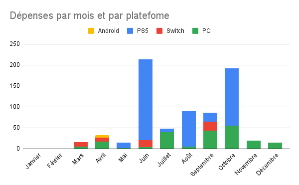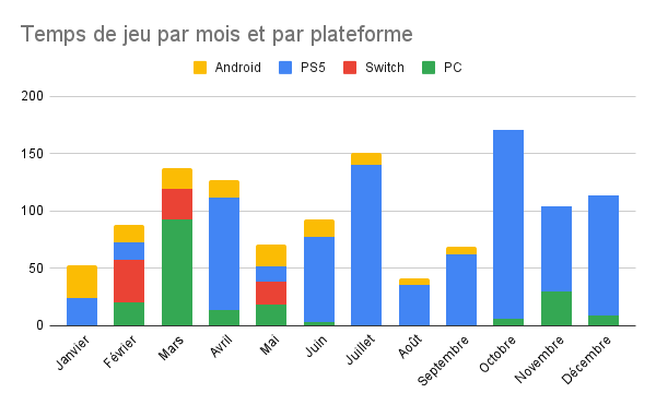 J’ai retrouvé un bon rythme de jeu après l’arrivée de mon deuxième enfant, ce qui explique les chiffres proches en temps de jeu de 2023. Mon temps de Slay the Spire s’est enfin un peu réduit, donc j’ai eu le temps de finir encore plus d’autres jeux. Enfin, la dépense s’explique par ma pratique d’acheter des jeux neufs pour les revendre rapidement sur leboncoin (pratique pour jouer à moindre prix à Clair Obscur, Indiana Jones, Mafia the Old Country, Ghost of Yotei notamment).