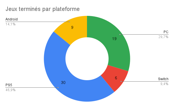 64 jeux finis, dont 4 DLC, 1 démo, 6 rejoués, pour 72 jeux joués (contre 30 jeux finis en 2024, et 40 en 2023)