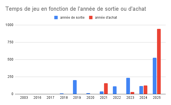 C’est ce graphique où l’on voit que je ne joue quasiment qu’aux jeux que je viens d’acheter. Parfois ce sont des jeux qui datent de quelques années, mais quasiment 75% de mon temps de jeu est sur des titres achetés dans l’année, alors que j’ai un backlog immense.
